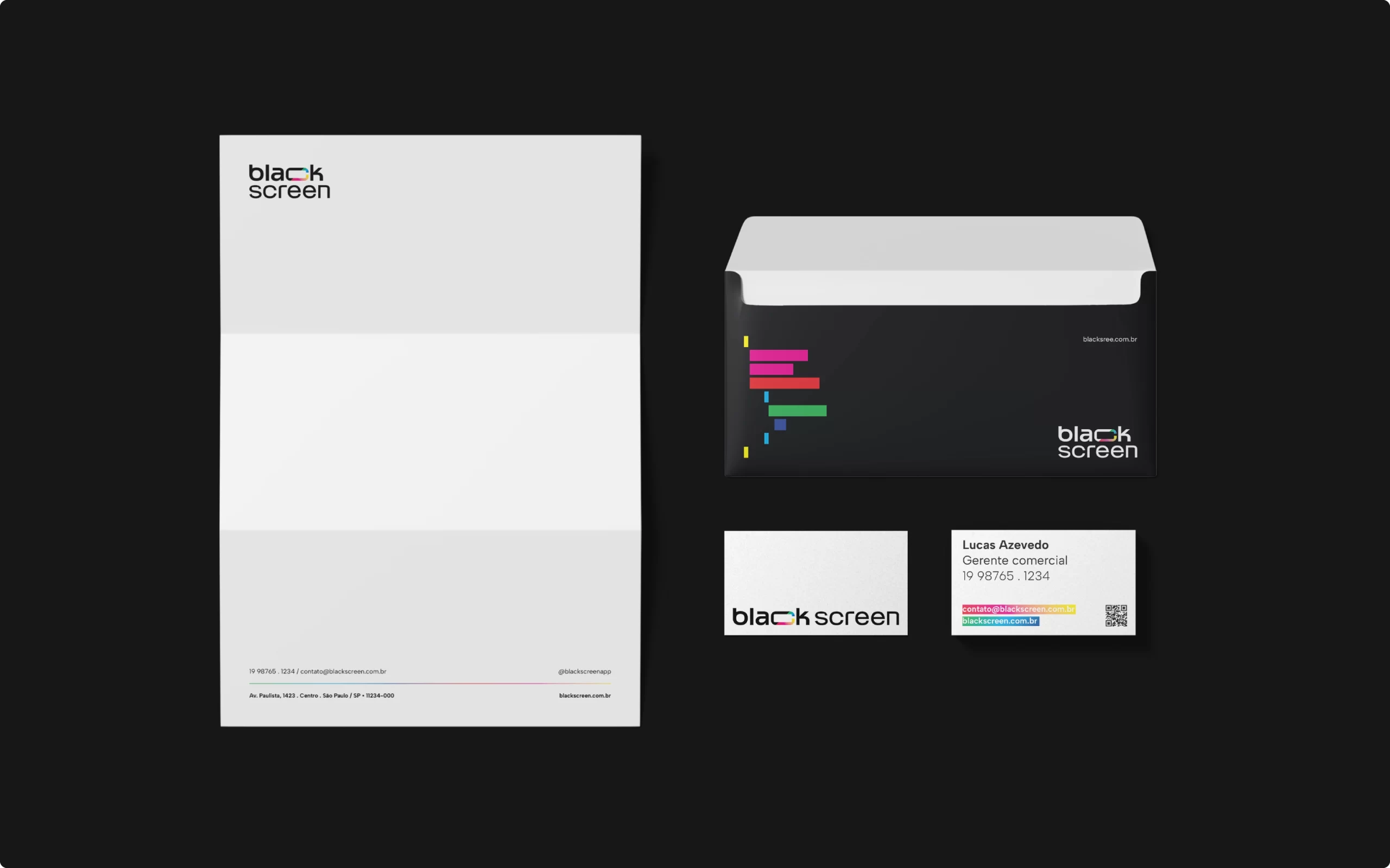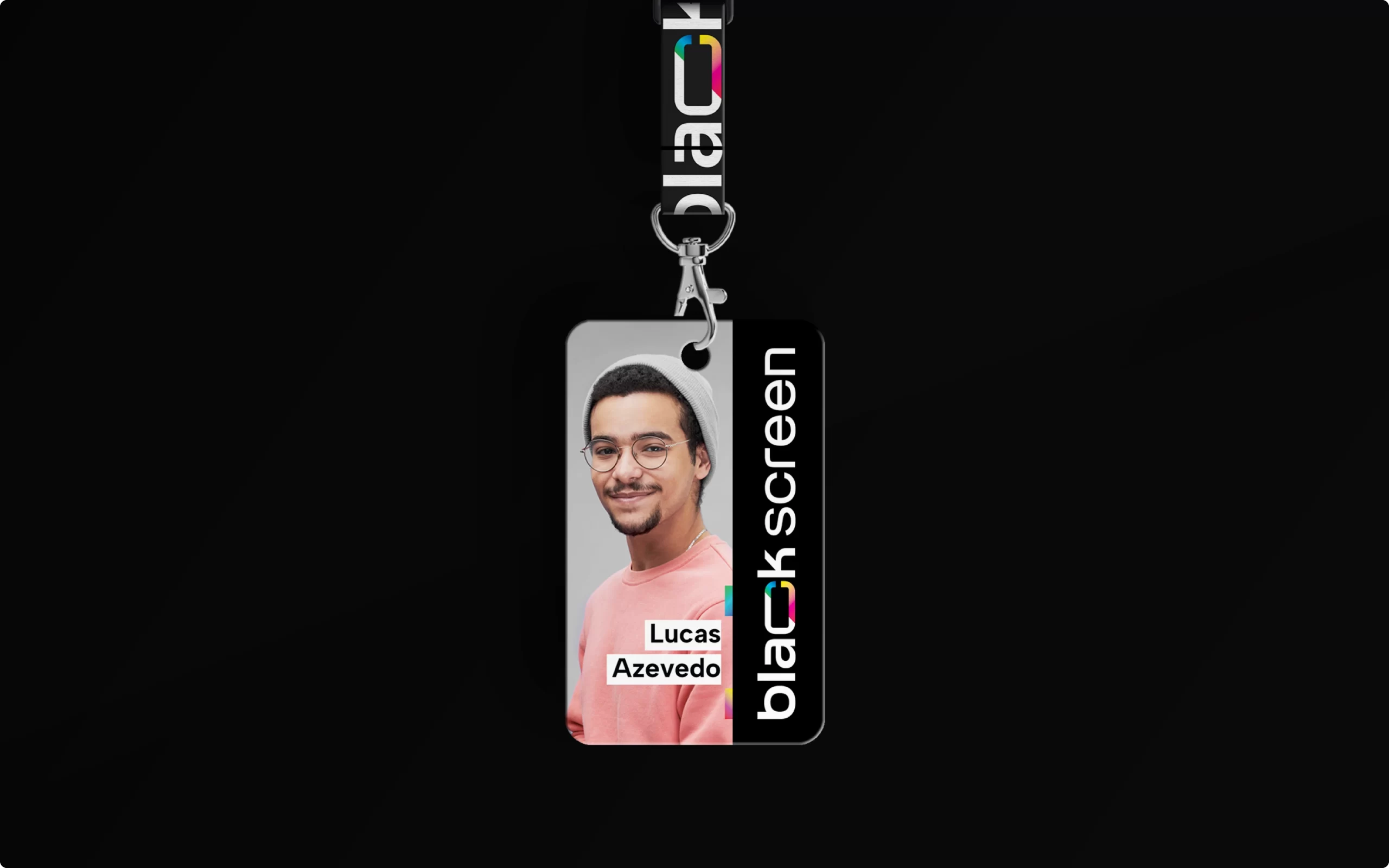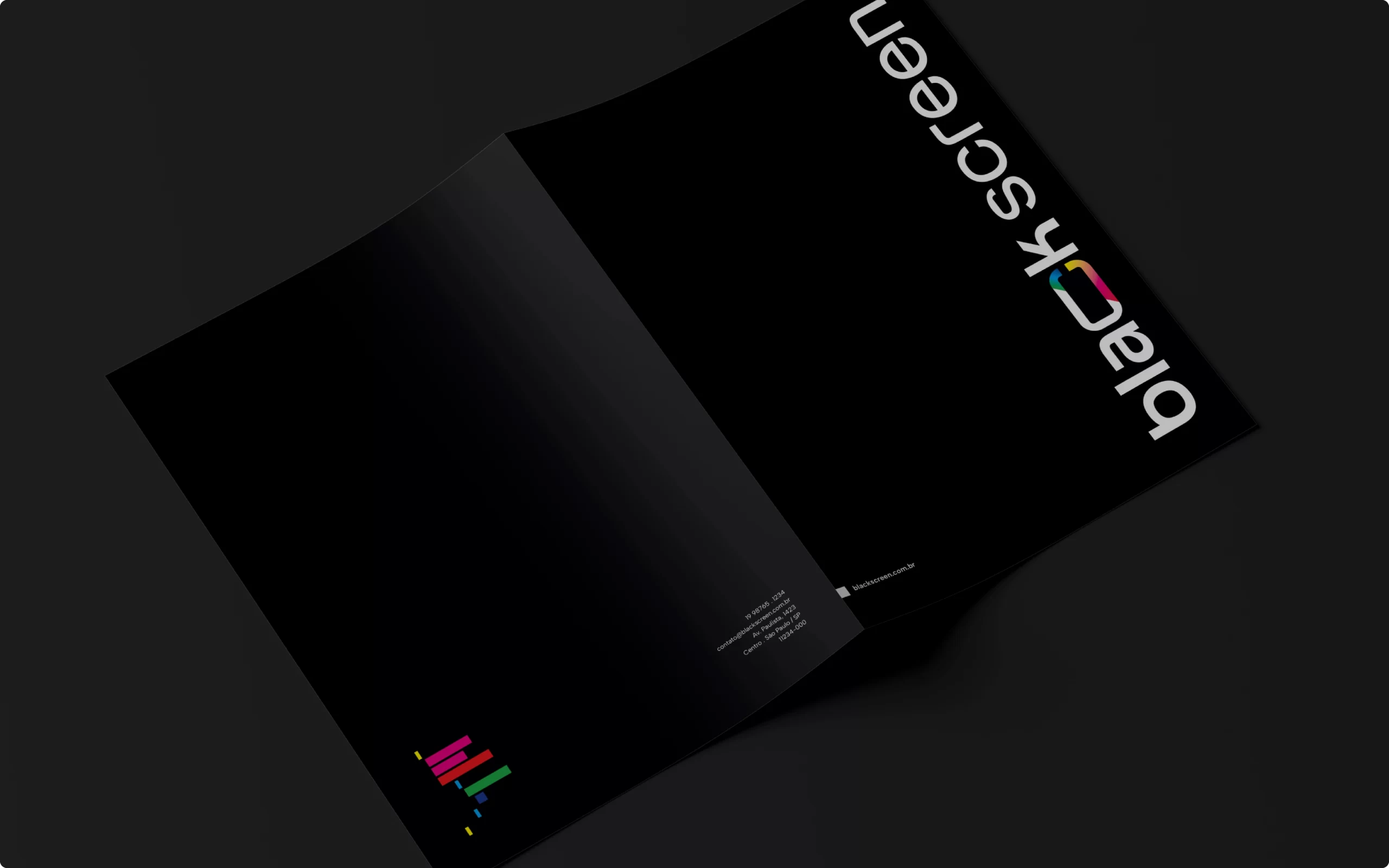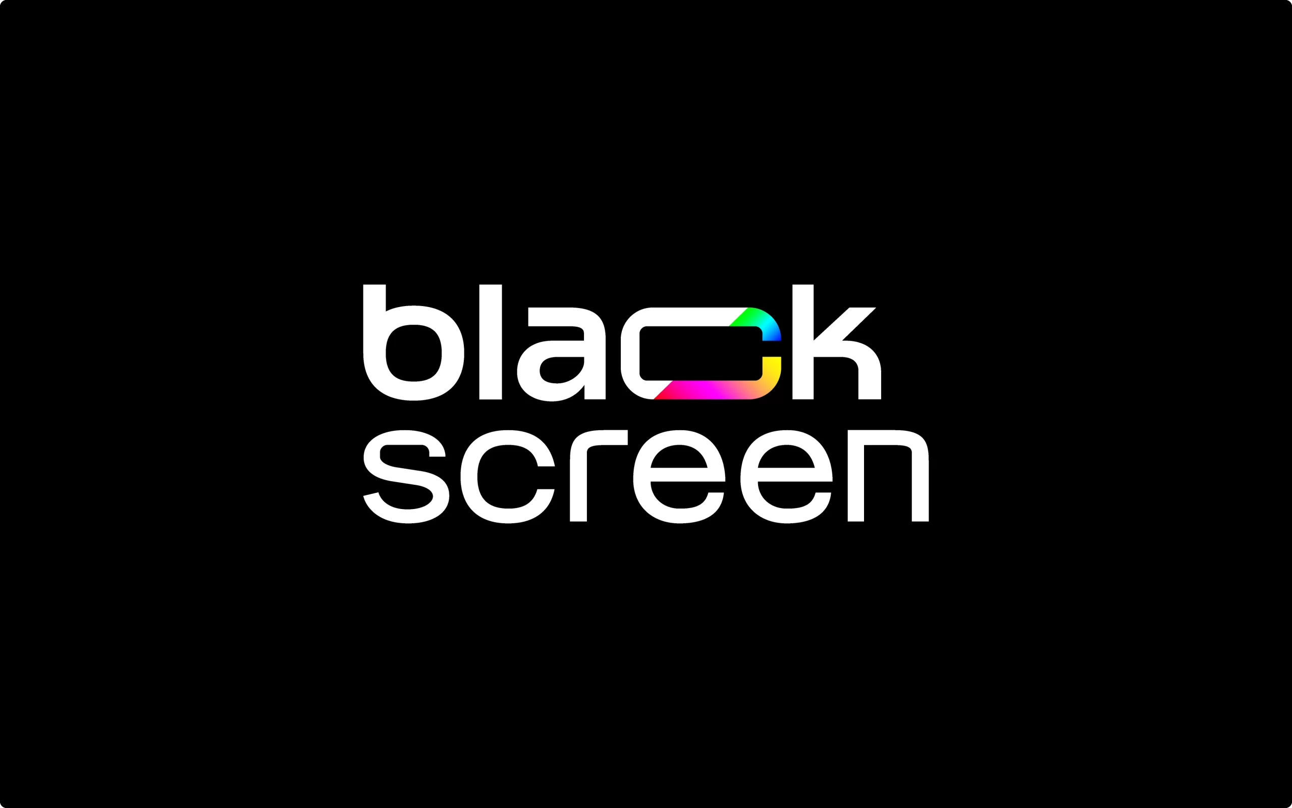 O destaque está na letra C, que traz um corte transversal revelando um mix vibrante de cores inspirado na paleta RGB e nos caracteres coloridos presentes nas linhas de código. Essa fusão entre o preto absoluto e o brilho das cores simboliza criatividade, agilidade e a capacidade da Blackscreen de unir o rigor técnico do desenvolvimento com o frescor da imaginação. Um projeto de branding que reforça posicionamento, propósito e presença digital.