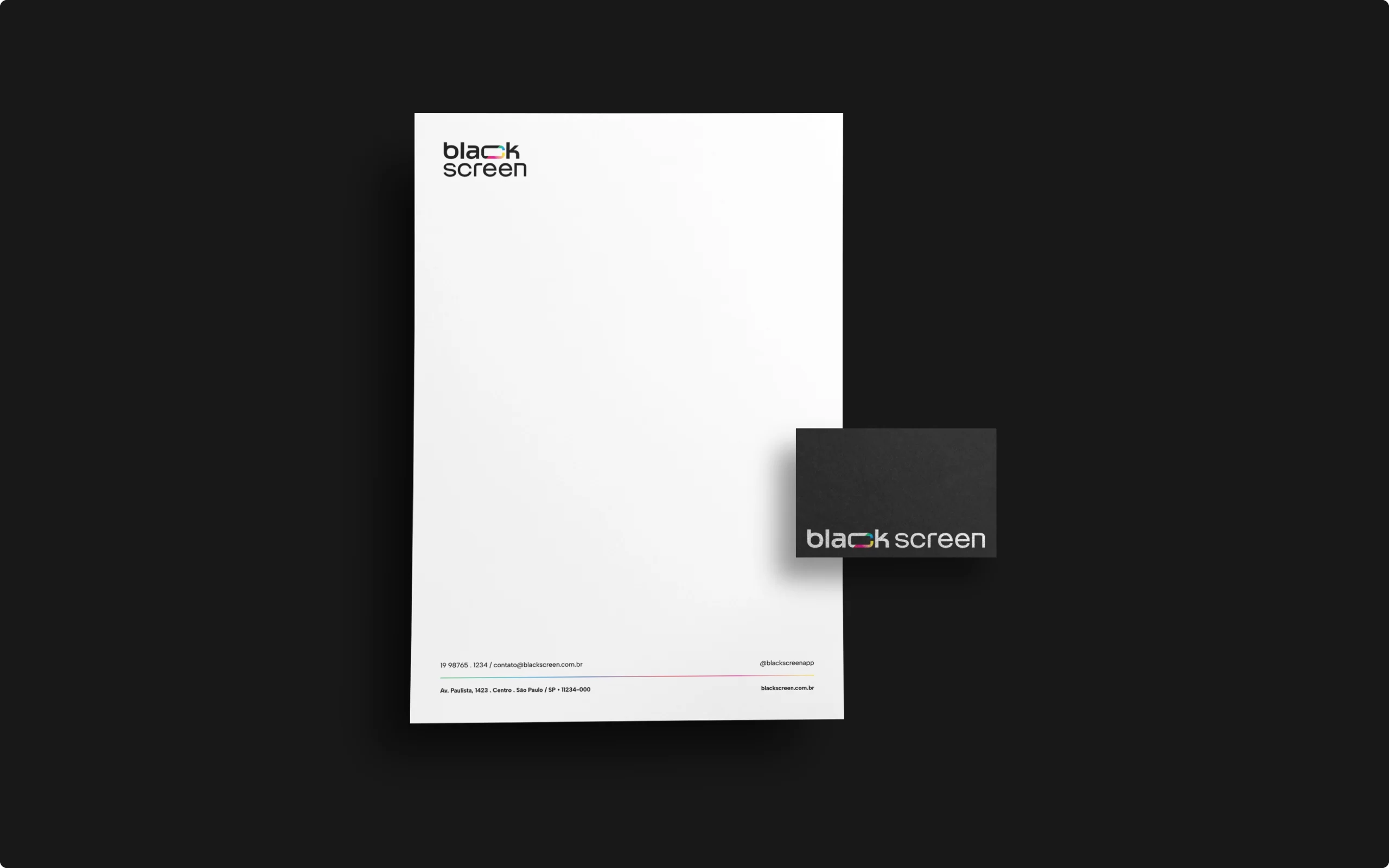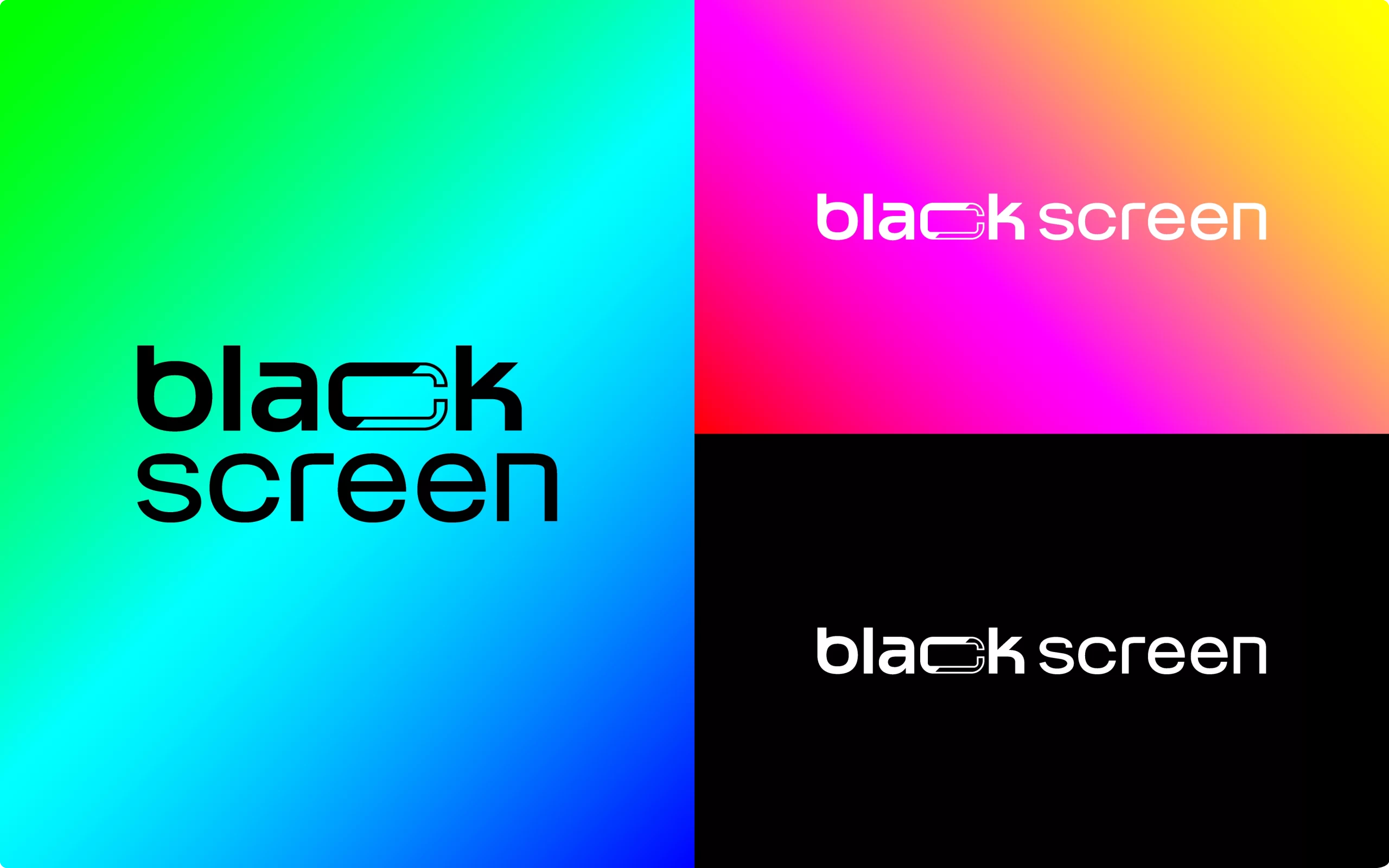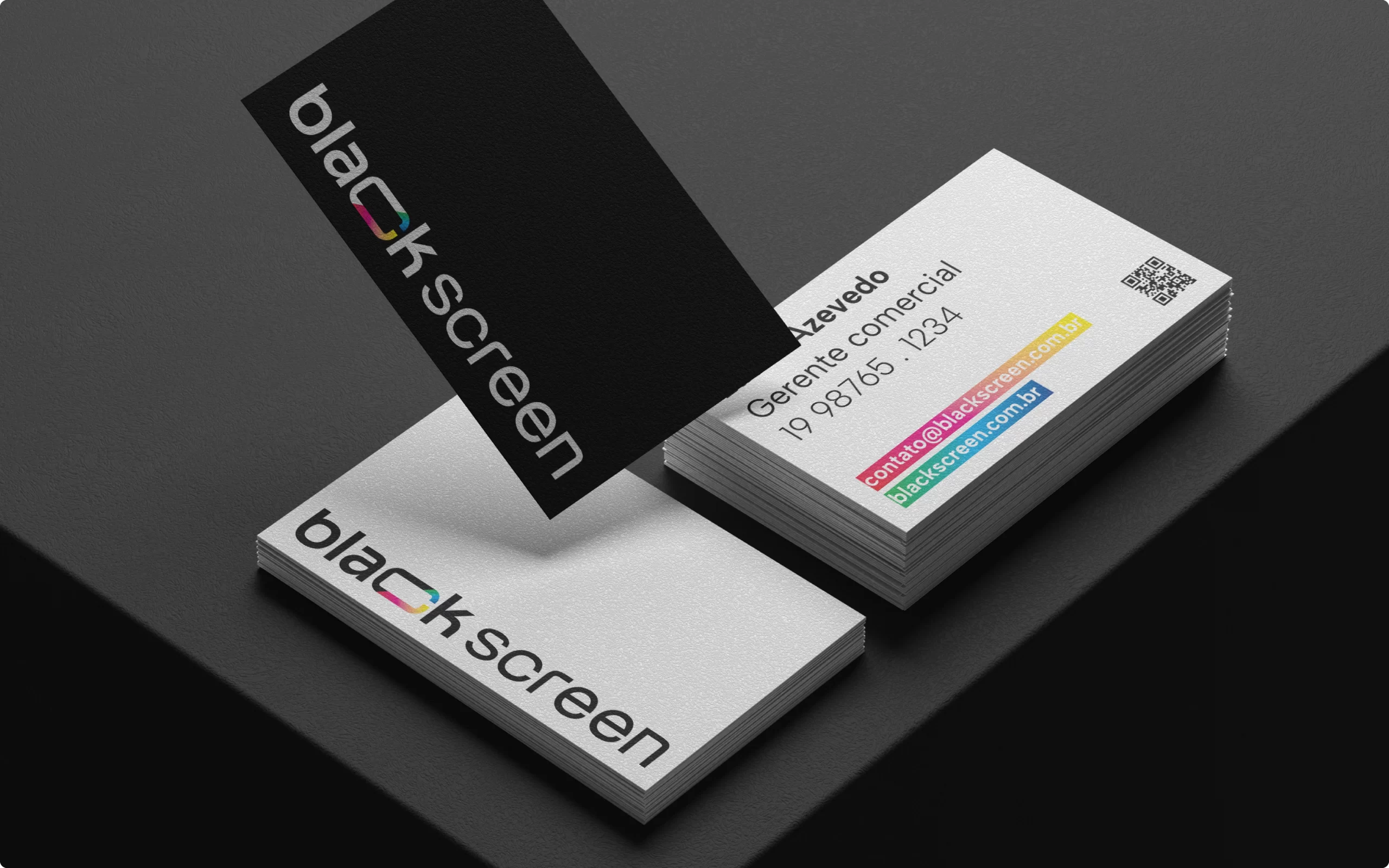 O destaque está na letra C, que traz um corte transversal revelando um mix vibrante de cores inspirado na paleta RGB e nos caracteres coloridos presentes nas linhas de código. Essa fusão entre o preto absoluto e o brilho das cores simboliza criatividade, agilidade e a capacidade da Blackscreen de unir o rigor técnico do desenvolvimento com o frescor da imaginação. Um projeto de branding que reforça posicionamento, propósito e presença digital.