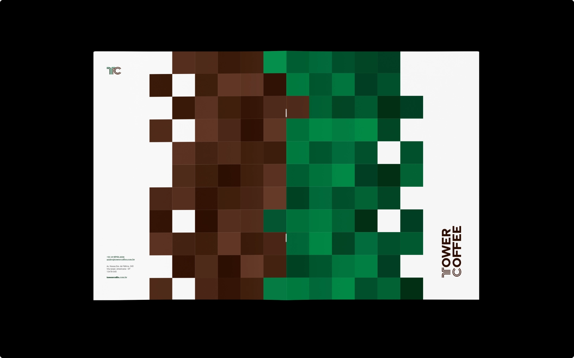 Criar a identidade visual da Tower Coffee foi um exercício de traduzir a alma de uma cafeteria localizada no coração de Americana em uma linguagem visual única. Nosso ponto de partida foi o próprio edifício onde a marca está inserida: uma construção moderna, toda revestida de janelas de vidro espelhado, que reflete a luz e cria um fascinante jogo de cores e formas. Cada janela parece um mosaico, e foi justamente essa sensação de movimento e fragmentação luminosa que inspirou a textura que permeia toda a identidade visual.